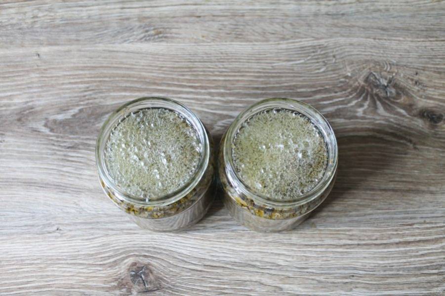 Извлеките банки, слейте воду и плотно уложите готовую грибную икру из подосиновиков до плечиков. Залейте верх горячим растительным маслом.