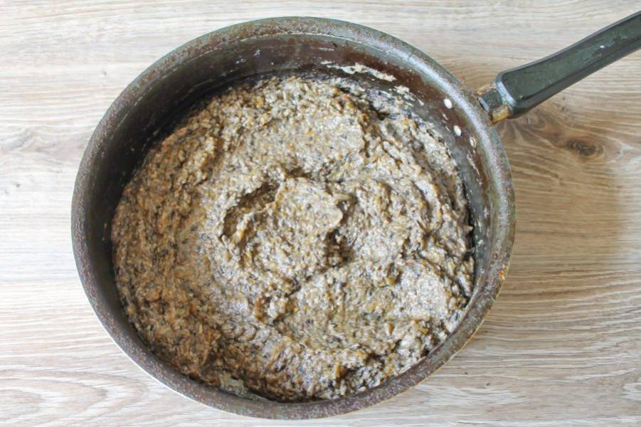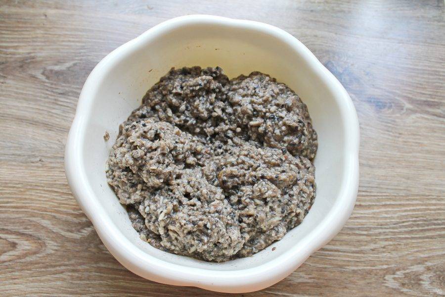 Пропустите грибы с луком через мясорубку с мелкой решеткой.