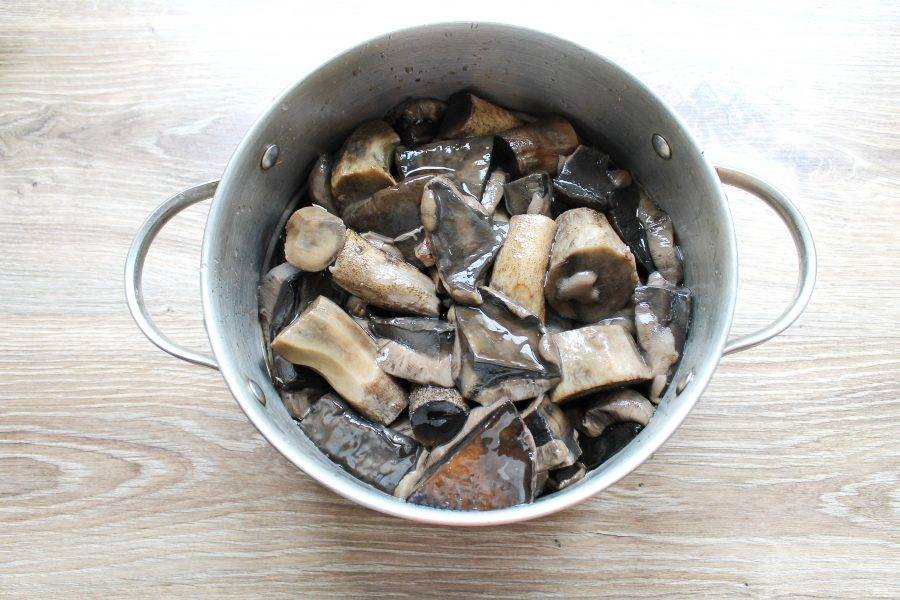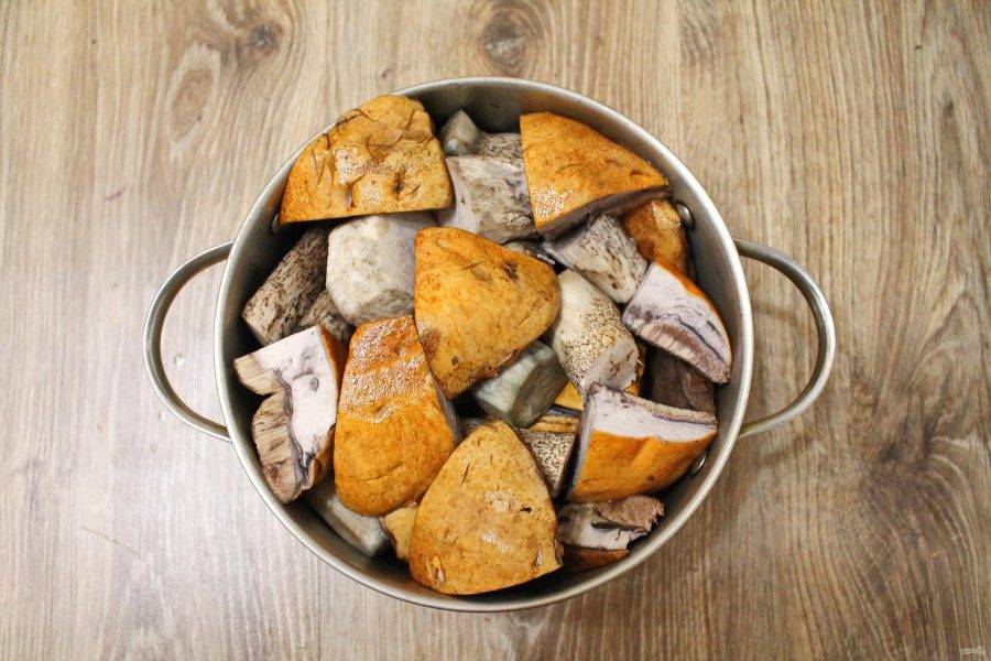 Выложите порезанные подосиновики в кастрюлю, налейте воду и отварите их в течение 30 минут на среднем огне.