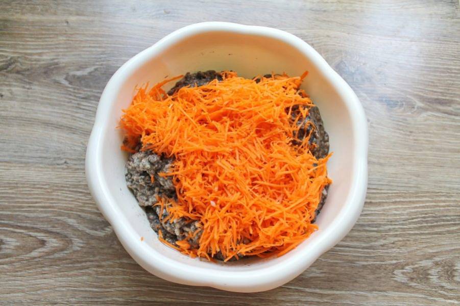 Морковь почистите, сполосните и натрите на средней терке. Выложите в миску с измельченными грибами, перемешайте.