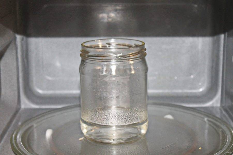 Подготовьте банки и крышки для заготовок. Вымойте их с пищевой содой в горячей воде. За пятнадцать минут до конца приготовления икры, положите крышки в кастрюлю, влейте воду и кипятите на среднем огне в течение 10 минут после закипания. В чистые банки налейте воду высотой 1-2 сантиметра снизу и поставьте в микроволновую печку. Стерилизуйте банки при мощности 800 Ватт в течение 4 минут.