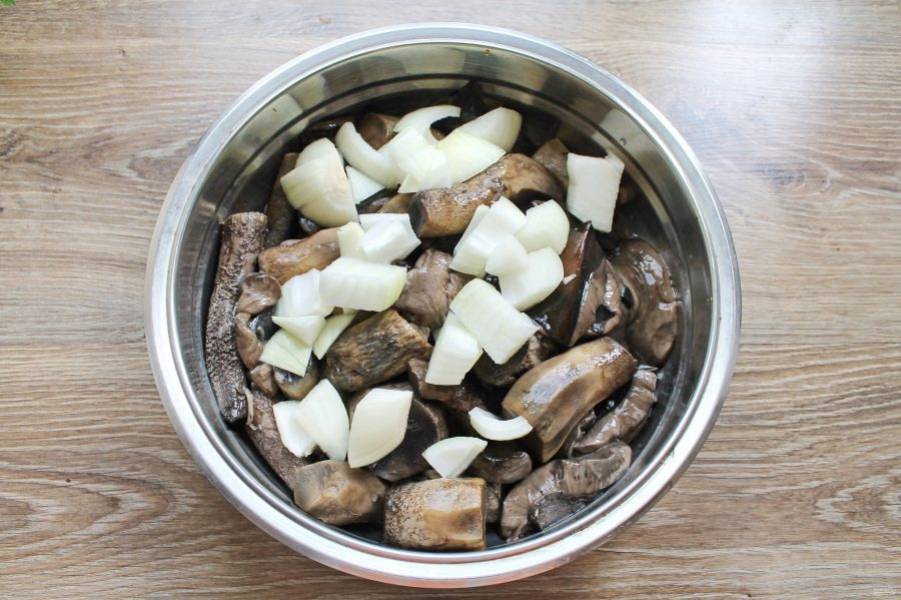 Лук почистите и порежьте на кусочки. Добавьте его к отварным грибам.