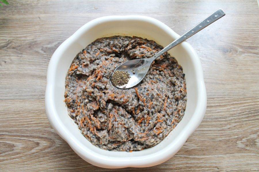 Грибную массу поперчите и перемешайте.