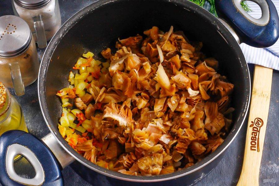 Нарежьте грибы средними кубиками, ломтиками, но не мельчите, так как икра отличается от паштета своей структурой. Паштет практически однородный, а в икре состоит из кусочков продуктов. Добавьте грибную нарезку в емкость и всыпьте соль, перемешайте.
