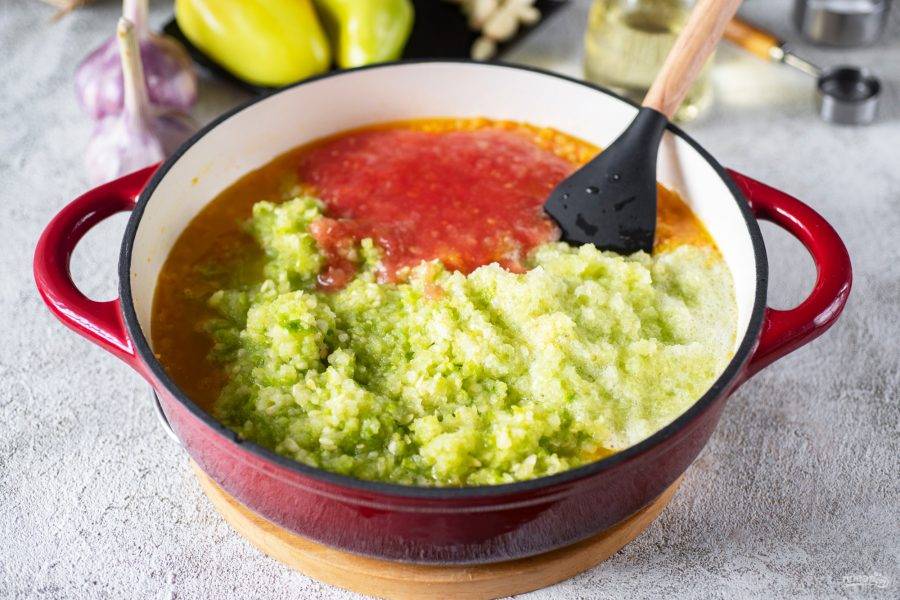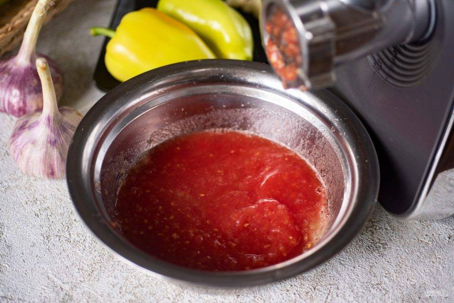 Снимите с помидоров кожицу и пропустите через мясорубку, переложите в отдельную тарелку.