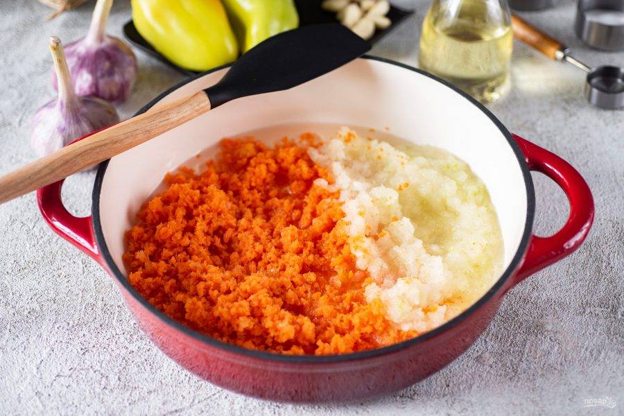 В просторную кастрюлю с толстым дном (у меня чугунная жаровня) залейте растительное масло, выложите морковь и лук.