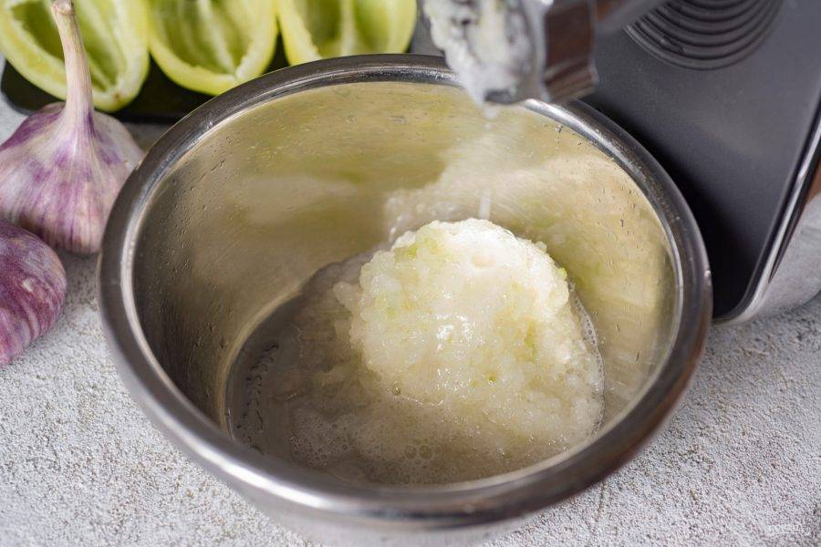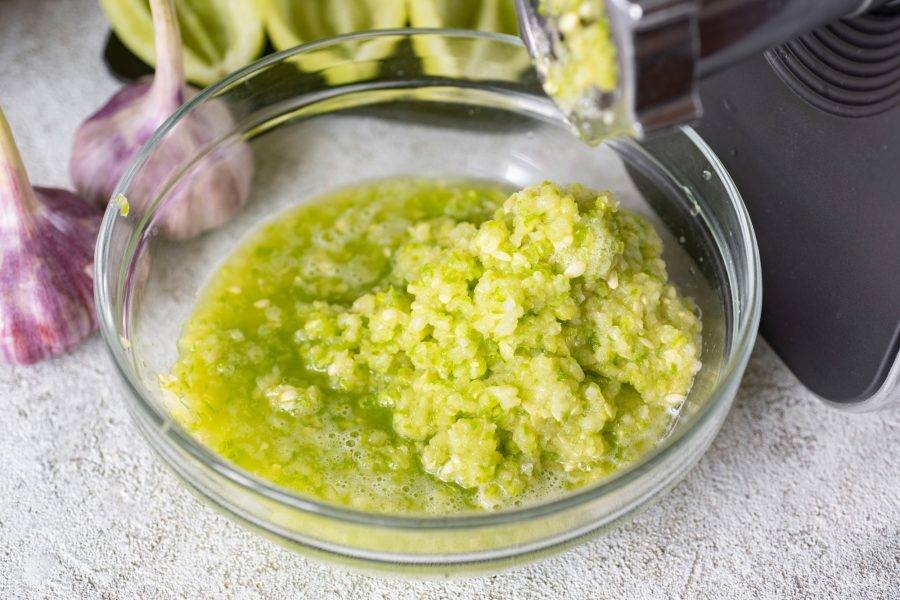 Через мясорубку сначала пропустите кабачки. Выложите кабачковую массу в отдельную тарелку.