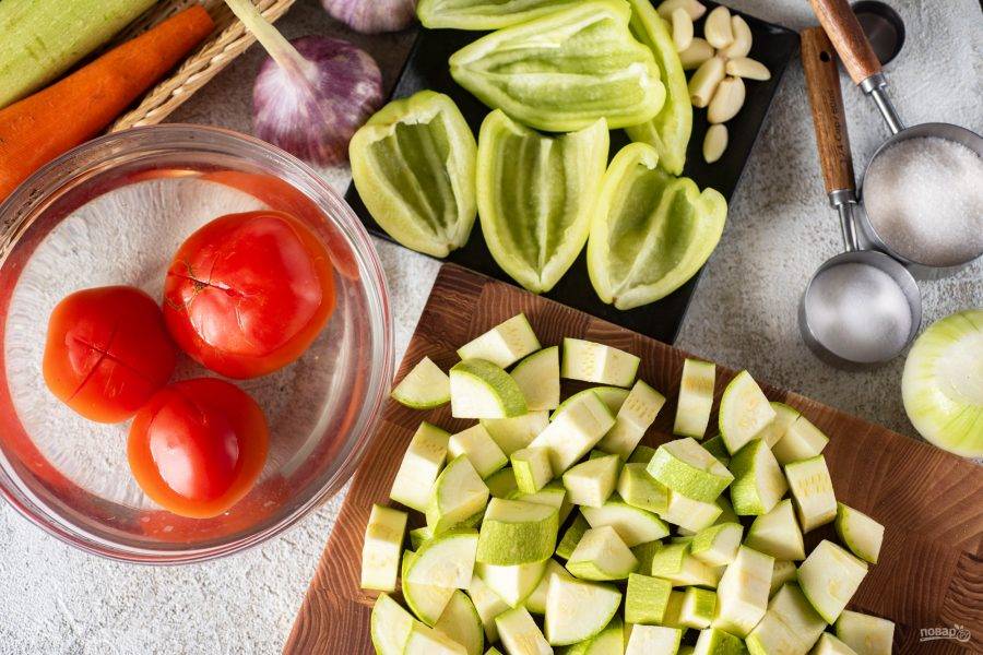 Нарежьте кабачки небольшими кубиками для удобства переработки в мясорубке. Помидоры слегка надрежьте ножом, выложите в миску, залейте кипятком на 30 секунд, после этого шкурку вы сможете снять с легкостью.