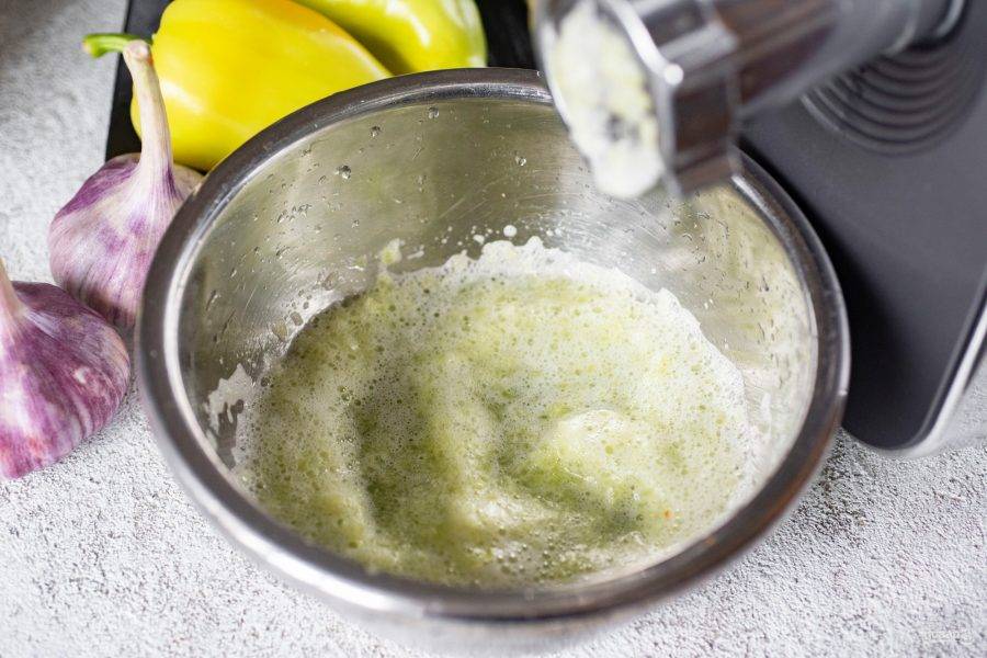 Следом пропустите через мясорубку перцы, переложите в отдельную тарелку.