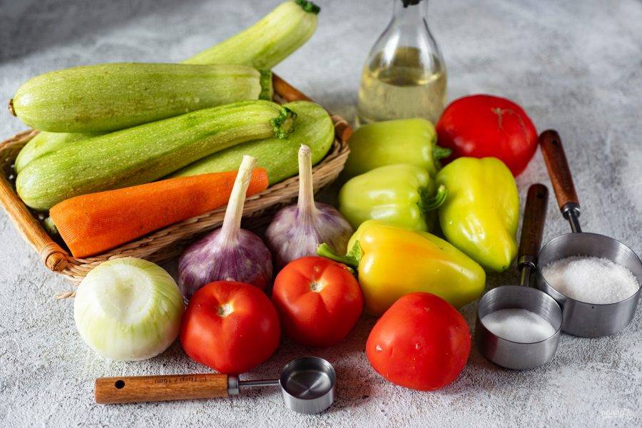 Все овощи почистите и помойте. Если есть необходимость, то снимите кожицу и удалите семена у кабачков. У болгарских перцев тоже удалите семена.