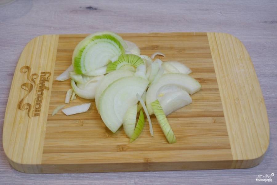 Репчатый лук нарезаем тонкими полукольцами. Сильно мельчить овощи нет смысла.