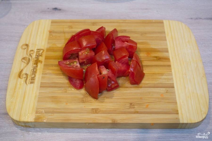 Свежие томаты нарежьте кубиком и добавьте к кабачкам. Тушите все до готовности. В конце тушения добавьте соль, немного молотого перца и имеющихся трав-приправ на ваш вкус.