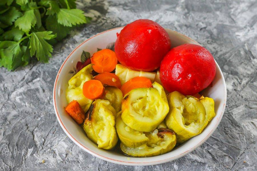 Помидоры залейте кипятком на 10 минут и снимите с них кожуру. Нарежьте запеченные овощи кружочками.