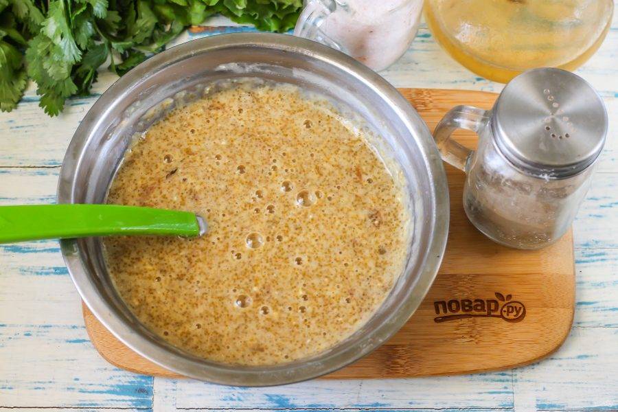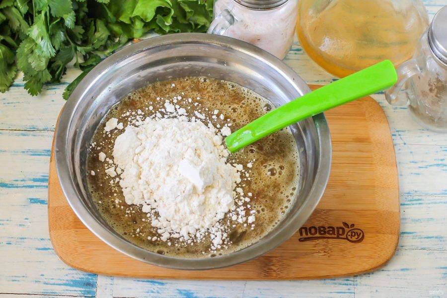 Влейте воду, перемешайте. Всыпьте пшеничную муку высшего сорта и еще раз взбейте.