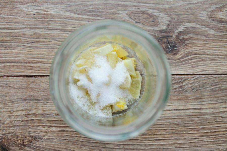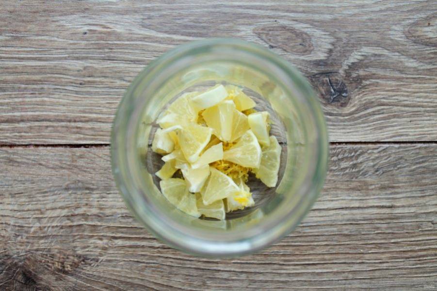 С половинки лимона срежьте белую часть, а сам лимон нарежьте кусочками. Добавьте лимон в банку с цедрой.