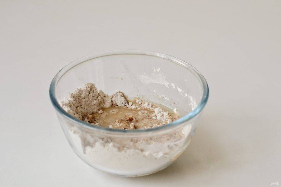 Добавьте масло, перемешайте. Затем влейте воду. Замесите тесто.