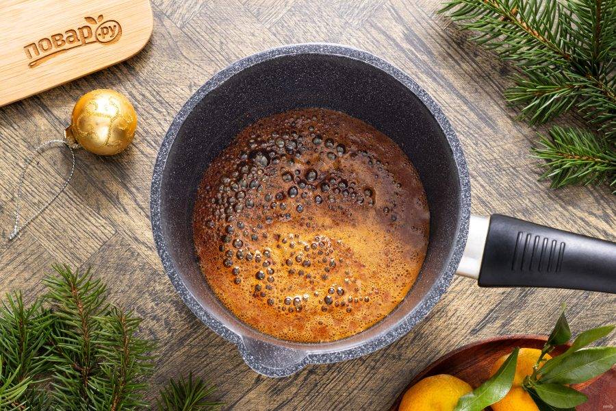 Растопите на среднем огне сахара до жидкого состояния. Он должен приобрести карамельный цвет.