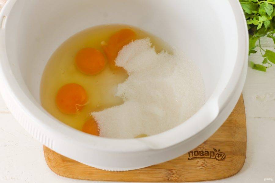 Куриные яйца вбейте в чашу миксера или кухонного комбайна, всыпьте соль и сахар. Взбейте яйца в течение 3-5 минут в пышную пену, она должна побелеть и увеличиться в объеме. Главное — не перевзбить массу, иначе она расслоится.