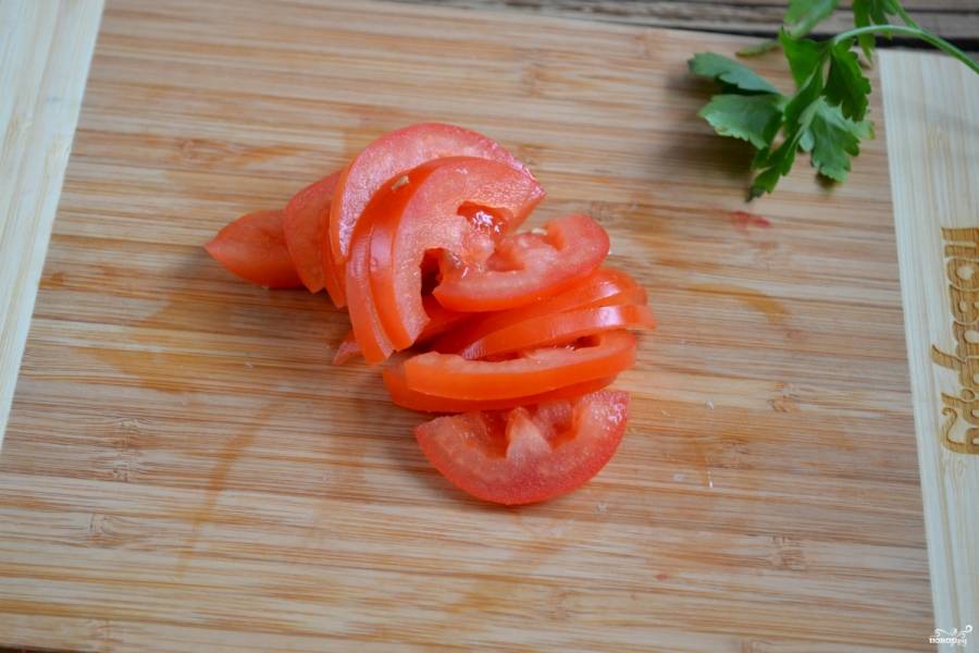 К полуготовому, но хорошо обжаренному мясу отправьте лук и помидор, пожарьте буквально 2-3 минуты, затем добавьте 100 мл. воды и тушите под крышкой до готовности мяса (примерно 10-15 минут). Я использовала молодую индейку, поэтому у меня на это ушло всего 5-7 минут.
