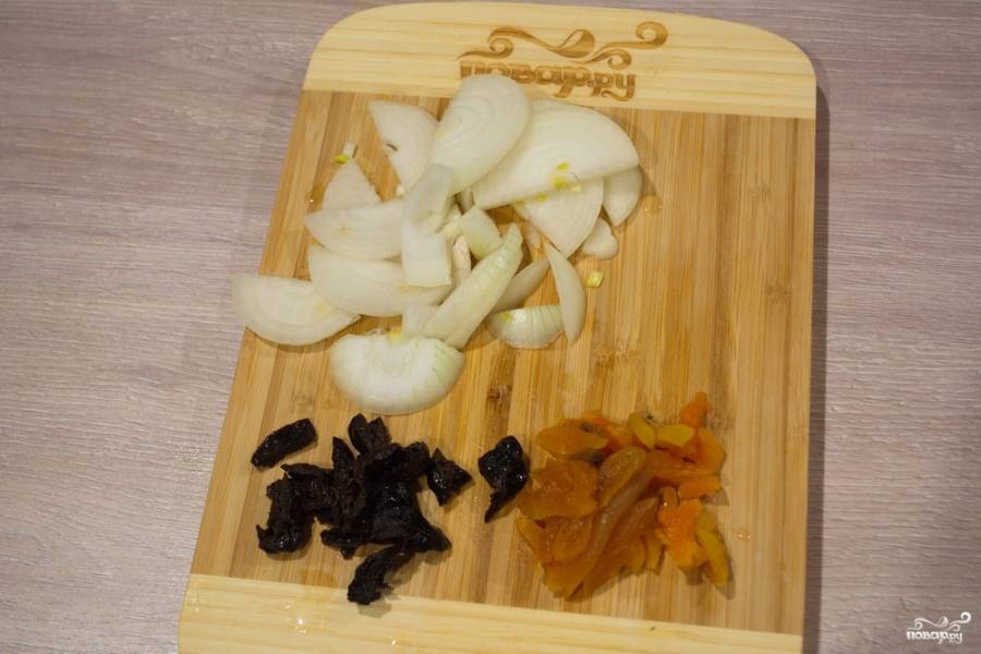 Репчатый лук нарежьте полукольцами. Промойте курагу и чернослив. Сухофрукты нарежьте мелкими кубиками.