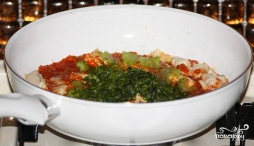 Добавляем в сковороду через 10 минут нарезанный укроп и специи по вкусу. Я добавляю тимьян.