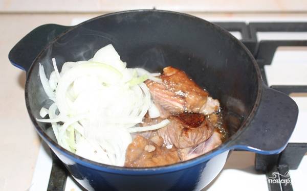 Пока мясо обжаривается в казане, начинаем готовить наши овощи. Нарезаем лук полукольцами, а также режем морковку маленькими кубиками. Всё это ложем в казан, с очередностью в 5 минут и перемешиваем.