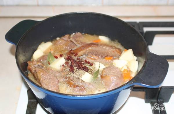 Приступаем к финальной части. Добавляем барбарис, зиру, лавровый листок, перец горошком и чайную ложку соли. На этом этапе также необходимо влить 250 мл воды. Всё хорошенько перемешайте и накройте казан крышкой. Продолжайте тушить 20 минут, пока картошка не приготовится. Теперь смело подавайте блюдо к столу. Приятного аппетита!
