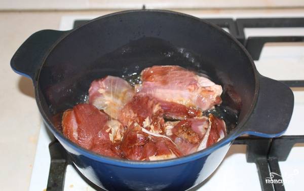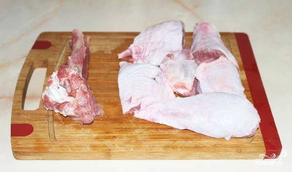 Как обычно, начинаем с подготовки нашего мяса. Промываем хорошенько голень индейки, начинаем её разделывать. Отделите мясо от костей, порежьте его на крупные куски, можно напополам.