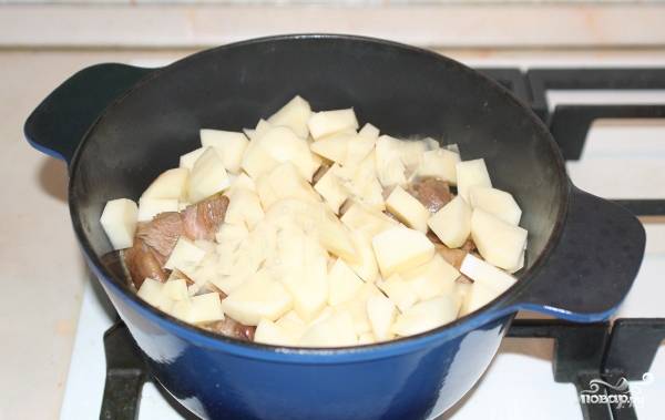 Теперь пришла очередь к картофелю. Очищаем его и режим удобными для вас кубиками. Закидываем в казан к остальным ингредиентам и перемешиваем.