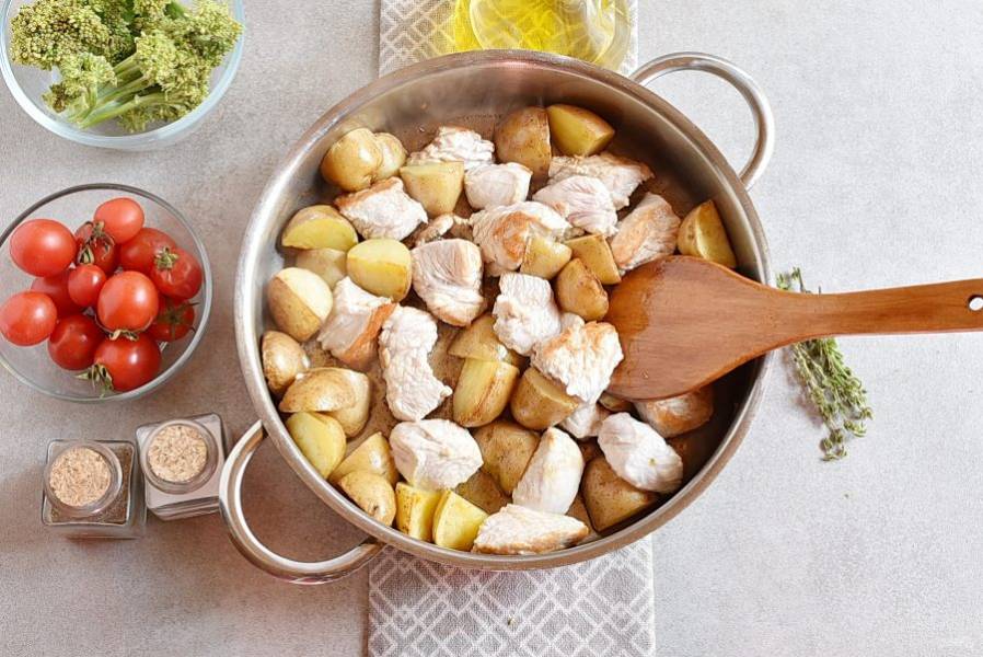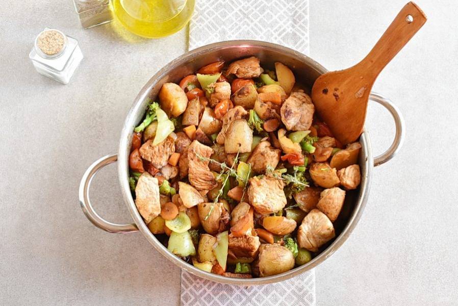 Добавьте помидоры черри половинками, разобранную на соцветия брокколи. Посолите и поперчите, добавьте листики тимьяна. Перемешайте и жарьте еще от 5 до 7 минут, помешивая, до готовности овощей.