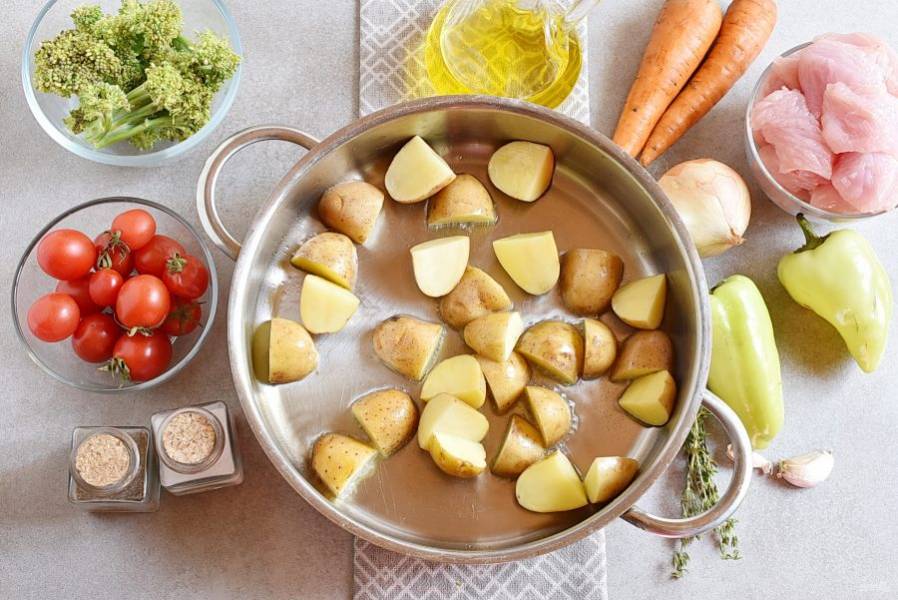 Молодой картофель вымойте, обсушите и нарежьте половинками вместе с кожурой. Разогрейте масло в глубоком сотейнике, и обжарьте картофель до легкого румянца.