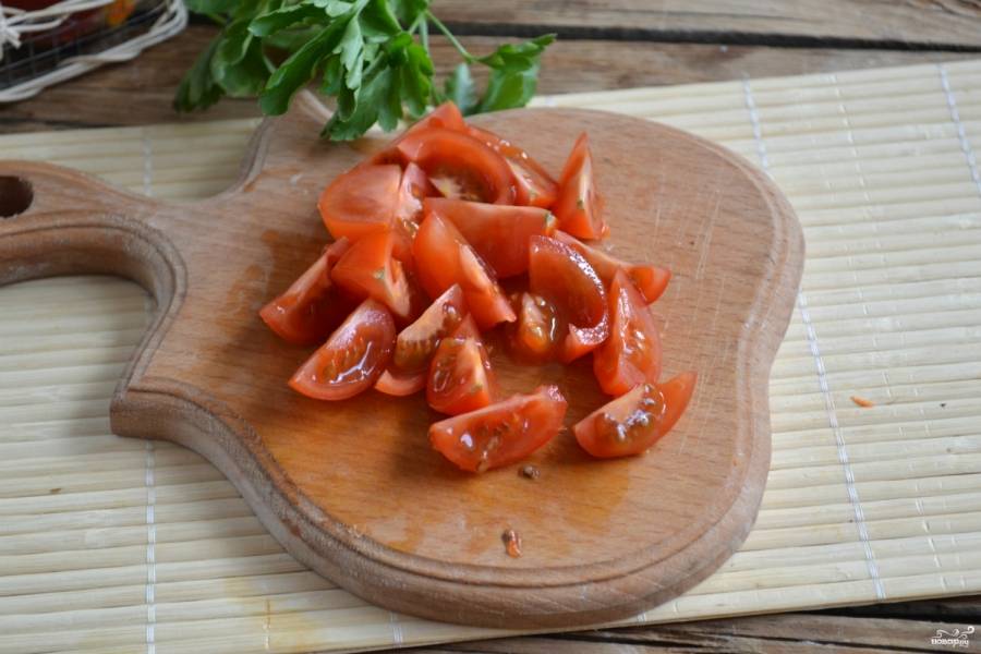 Помидоры порежьте на 6 частей. Много помидоров не стоит использовать, они должны придать лишь легкую кислинку блюду.