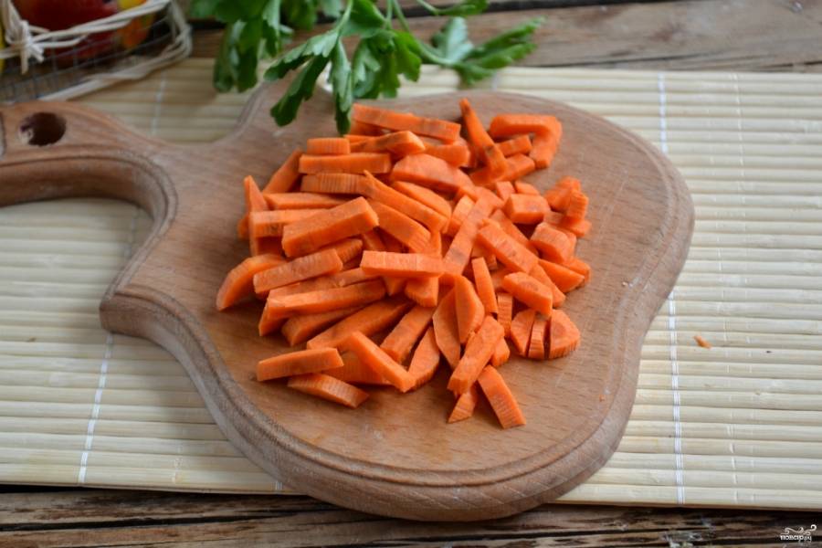 Морковь очистите и порежьте крупной соломкой.