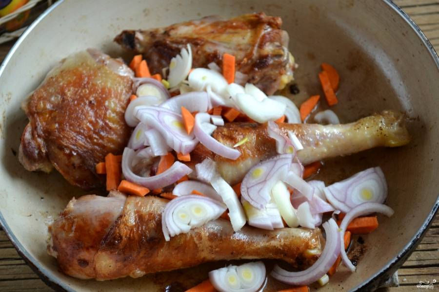 Мясо обжарьте до золотистого цвета. Добавьте морковь и лук, соль и перец, обжаривайте еще 2-3 минуты. Затем залейте содержимое сковороды водой и тушите 10 минут. В конце добавьте помидоры.