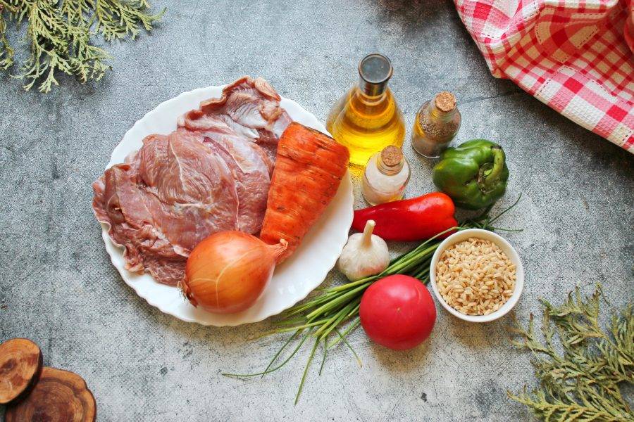 Подготовьте все необходимые ингредиенты для приготовления индейки с рисом и овощами. Овощи вымойте и при необходимости почистите.
