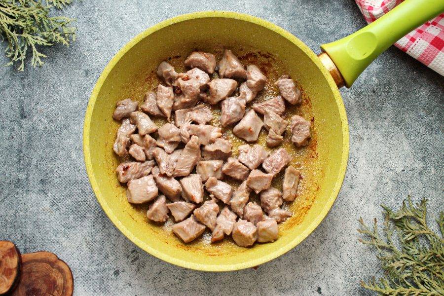 Филе индейки сполосните и обсушите бумажными салфетками, порежьте мясо средними кусочками. В сковороду налейте растительное масло, разогрейте на сильном огне. Выложите в сковороду индейку и обжаривайте в течение 3-4 минут.