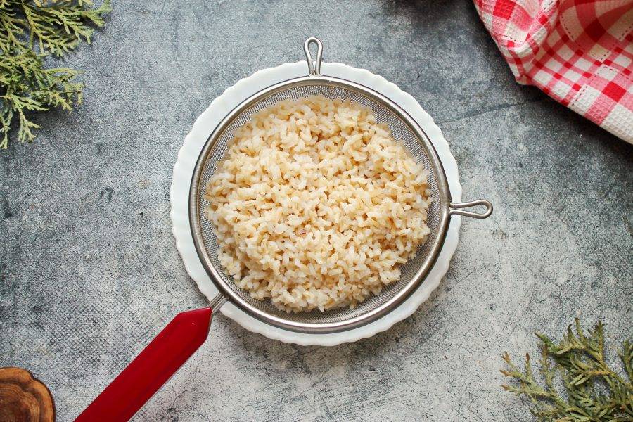 Рис тщательно промойте и отварите в соленой воде до готовности. Откиньте на сито, чтобы жидкость стекла.