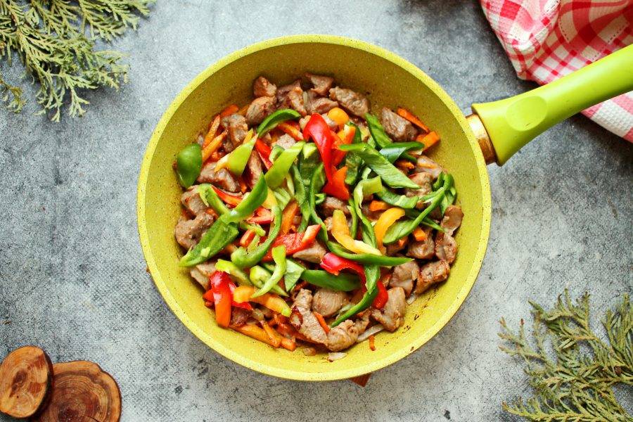 У болгарского перца удалите плодоножку и семена, порежьте соломкой и добавьте в сковороду. Обжаривайте все на среднем огне еще пять минут, перемешивая.