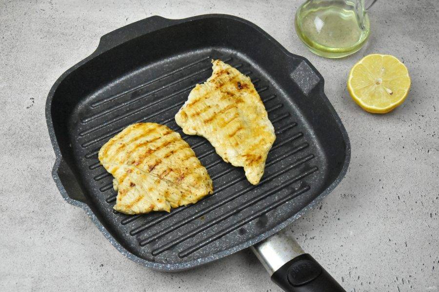 Нагрейте на огне выше среднего сковороду гриль. Выложите подготовленное филе индейки и обжарьте его на среднем огне по 2 минуты с каждой стороны, до образования на поверхности характерных грильных полос.