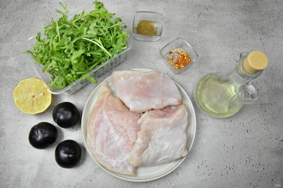Подготовьте продукты для приготовления блюда. Сливы лучше использовать плотные и сладкие. Чем слаще будет слива, тем интереснее и контрастнее вкус блюда.