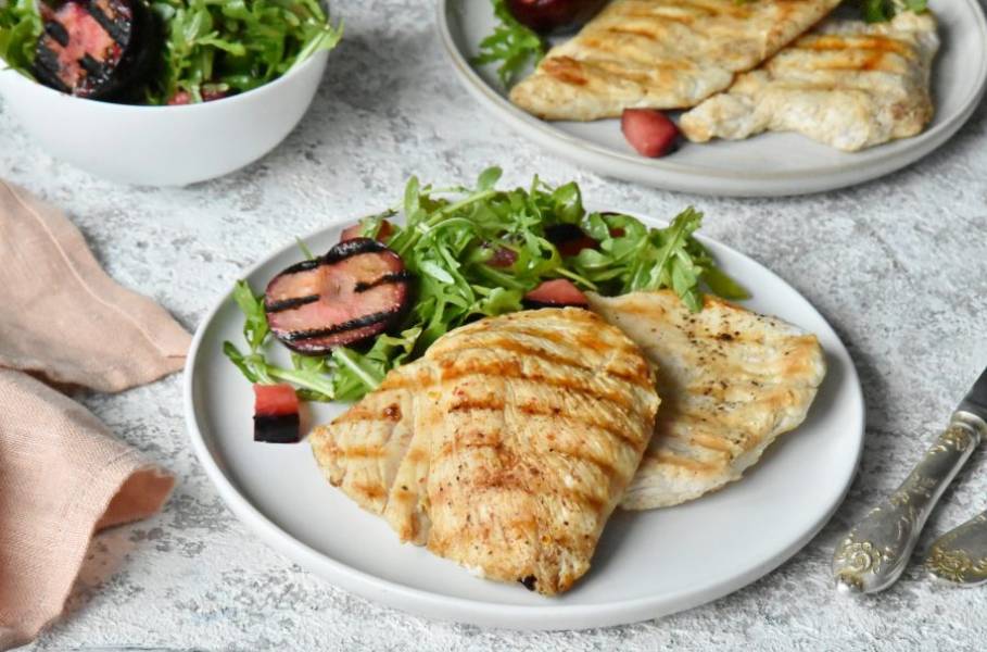Готовим отбивные из индейки с сочным гарниром из жареных на гриле слив и свежей руколы. В этом блюде соединились сладкий вкус слив, терпкий и пикантный вкус руколы и пряный вкус кориандра и чили.