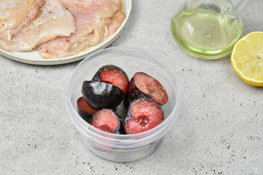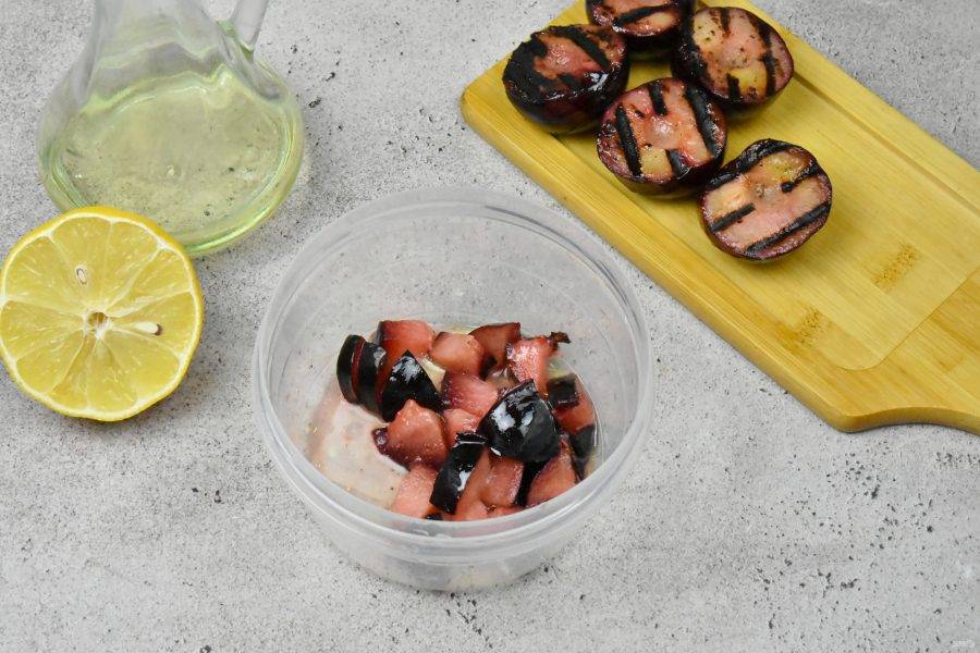 На сковороде где обжаривалось мясо, приготовьте сливы. Жарьте их 3-4 минуты, перевернув 1 раз. Несколько слив нарежьте кусочками среднего размера и переложите в оставшийся маринад. Добавьте к ним лимонный сок и перемешайте.
