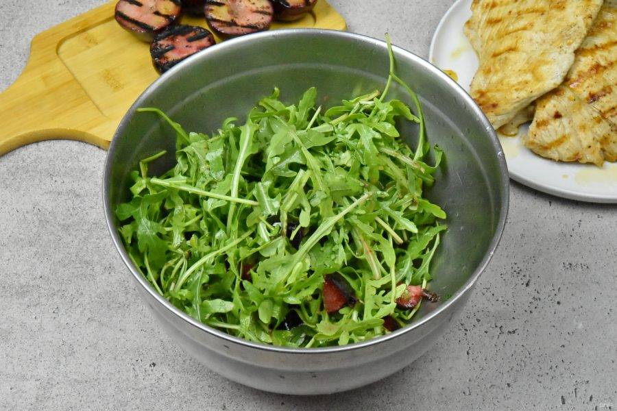 Руколу промойте, хорошо просушите. Выложите в нее сливы вместе с маринадом и перемешайте.
