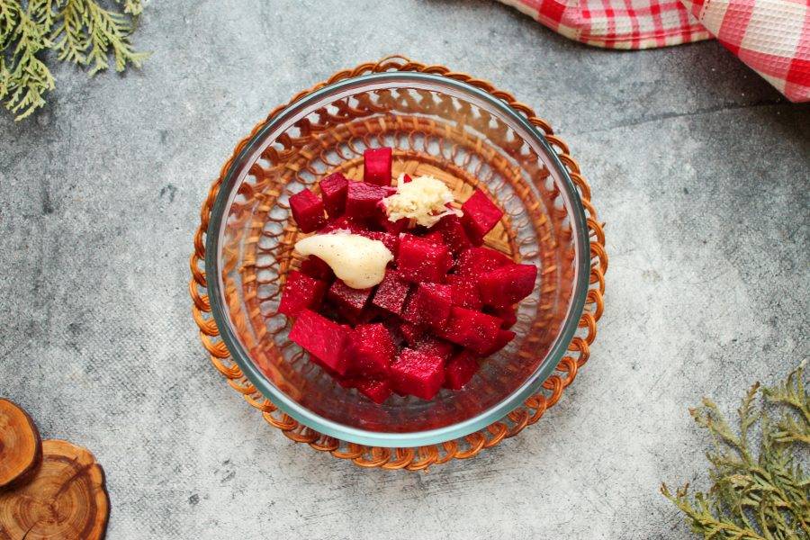Свеклу нарежьте небольшим кубиком, добавьте мед, посолите, поперчите, выложите оставшийся чеснок и тимьян. Влейте в свеклу растительное масло, перемешайте и оставьте при комнатной температуре на 15 минут.