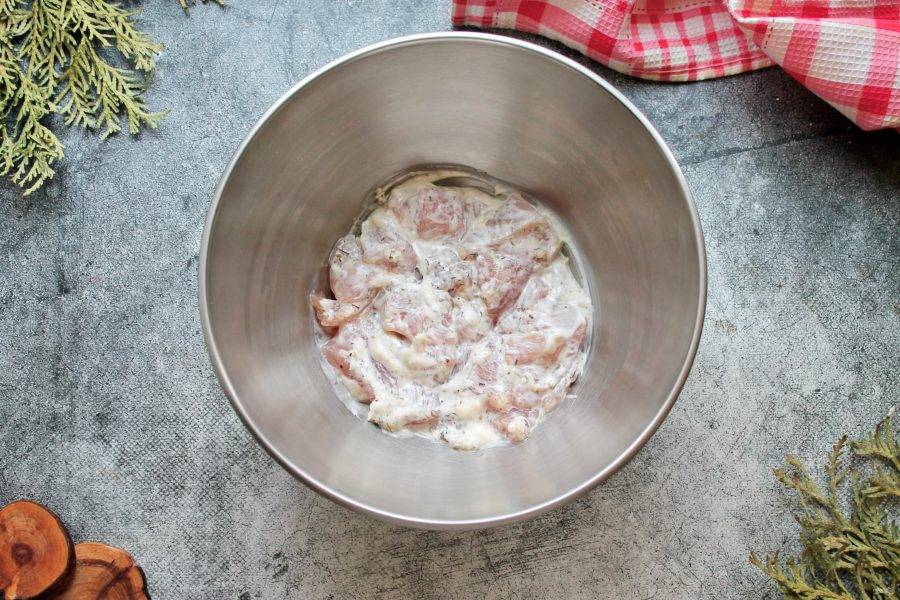 Филе индейки сполосните, обсушите и порежьте средними кусочками. Выложите мясо в миску, добавьте половину измельченного чеснока, соль, черный перец, тимьян и майонез, перемешайте. Оставьте все в холодильнике на 20 минут для маринования.