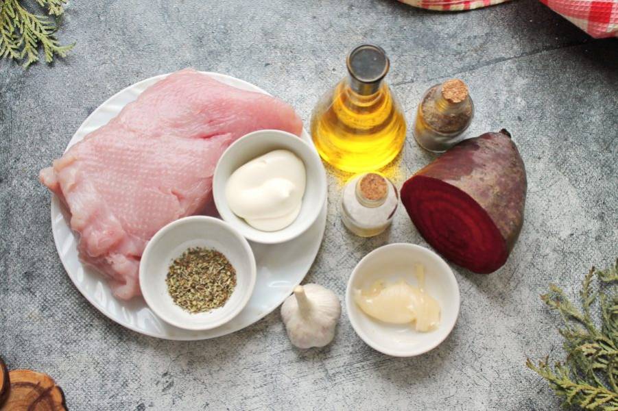 Подготовьте все необходимые ингредиенты для приготовления индейки со свеклой в духовке. Свеклу почистите и вымойте.