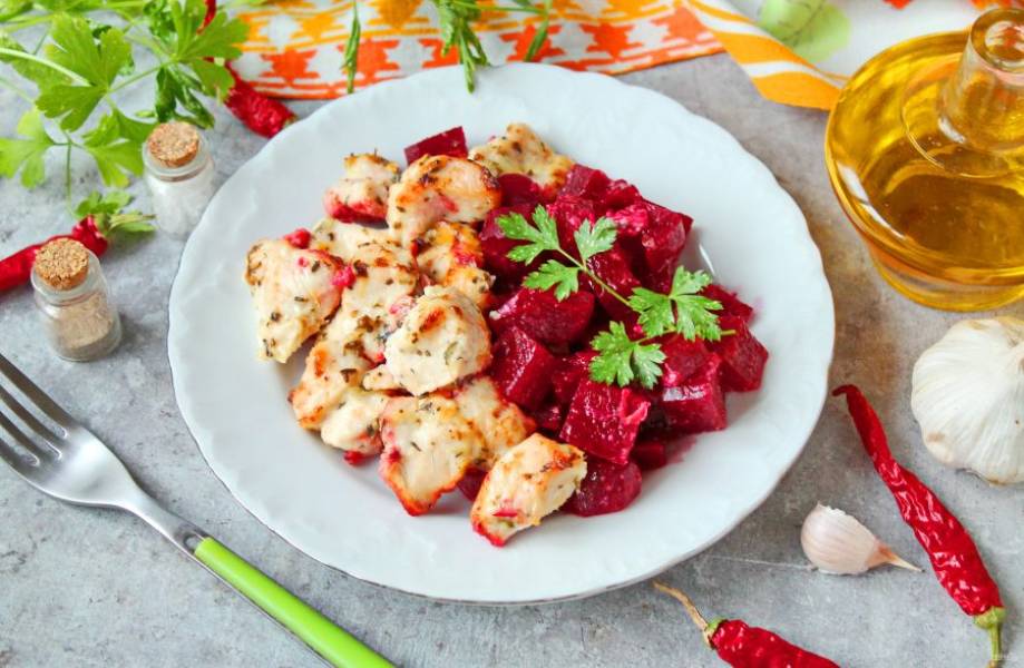 Форму с индейкой и свеклой поставьте в горячую духовку и запекайте при температуре 180 градусов в течение 35-40 минут.
