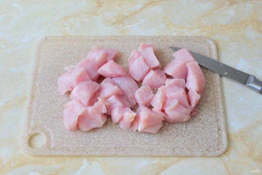 Мясо индейки нарежьте на кусочки.