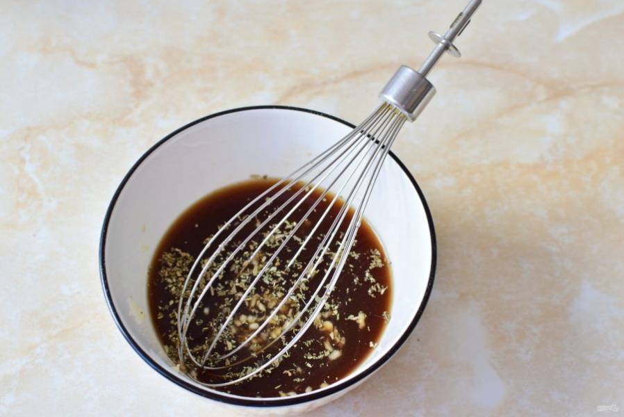 Добавьте в соус сахар и специи. Пропустите через пресс чеснок. Смешайте.