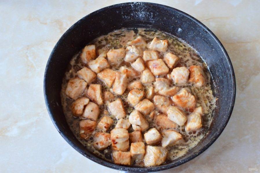 Постепенно мясной сок испарится. Мясо начнет поджариваться. Присыпьте индейку крахмалом и перемешайте.